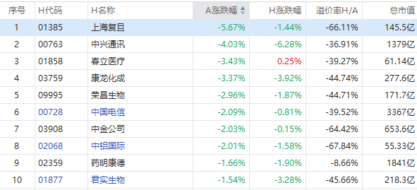 上海复旦A股跌5.67%,H股现跌1.44%;康龙化成A股跌3.37%,H股现跌3.92%,中国电信A股跌2.09%,H股现跌0.81%。
