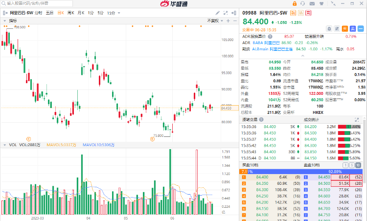 正股表现:阿里( $09988.HK )昨日终止5连跌,升约2.6%,今日再度下跌。早上低开约0.9%,及后在83至84港元附近窄幅上落。现报84.4港元,跌约1.23%。有报导引述消息指,阿里将最快今年第三季分拆旗下的菜鸟及盒马,向联交所提交上市申请。