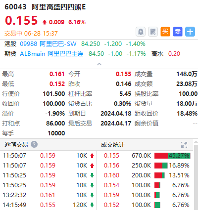 投资者如看淡阿里,认沽证方面可留意属7只相近条款产品最高杠杆的阿里沽 $11183.HK 。熊证方面可留意阿里熊 $60043.HK ,与现价有约16港元收回距离。