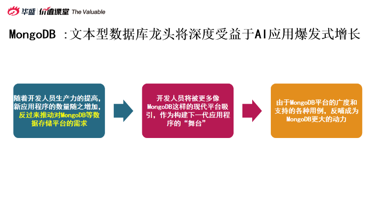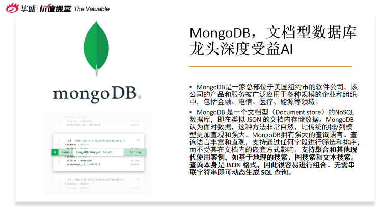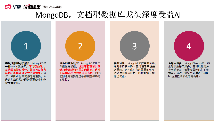 本周节目,言财老师就数据库领域龙头MongoDB,展开了深入分析。据介绍,该公司的数据库以其高扩展性、高性能和灵活性在行业中占据了首要地位。它能够处理大量的数据读写操作,而且能够存储和查询各种类型的非固定数据,这对于AI和机器学习应用程序至关重要。此外,MongoDB还支持实时数据分析和全球云服务,为开发者提供了更强大的工具。