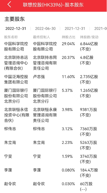 目前,联想控股第一大股东为中科院控股有限公司,持股29.04%;第二大股东北京联持志远管理咨询中心(有限合伙),持股20.37%,背后为柳传志等管理层控制的持股平台公司——北京联持志同管理咨询公司。