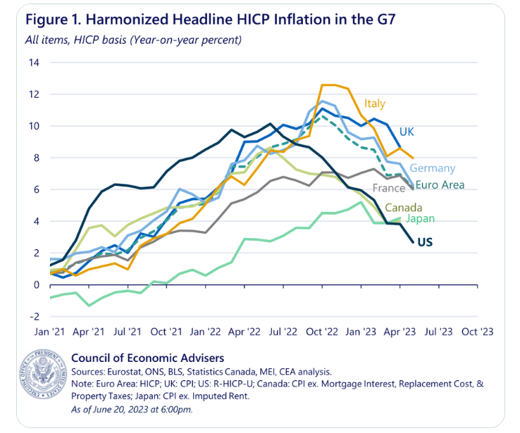 有一些证据表明鲍威尔的做法正在奏效。美国经济顾问委员会(CEA)周二发布了一份对七国集团(G7)国家近期通胀率的比较分析报告。CEA通过调和整体通胀数据发现,虽然通胀飙升最早在美国出现,但该国的12个月消费者价格协调指数(HICP)目前已低于其他G7国家。