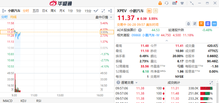 华盛资讯6月28日消息,美股新能源车板块早盘走强,截至发稿,小鹏汽车涨近4%,报11.37美元。Lucid涨近4%,Rivian涨超2%,理想汽车、福特汽车、蔚来跟涨。