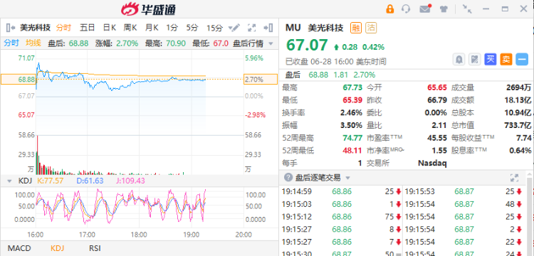 财报发布后,美光科技盘后一度涨超5%,突破70美元大关。