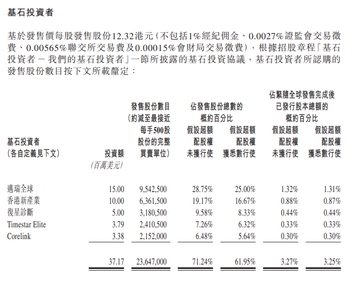 基石投资者已认购合共2364.7万股发售股份,合共占紧随全球发售完成后公司已发行股本约3.27%。根据发售价每股发售股份12.32港元及基石投资协议,具体基石投资者获配股份如下图: