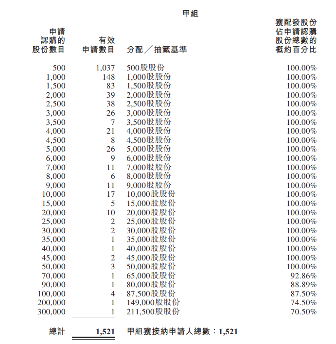 其中,香港公开发售项下初步提呈发售的香港发售股份已获轻微超额认购。公司合共接获1521份有效申请,认购合共352.45万股香港发售股份,相当于香港公开发售项下初步可供认购香港发售股份总数332万股的约1.06倍。