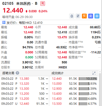 华盛资讯6月29日讯,来凯医药-B今日挂牌港股上市,截至发稿,微涨0.24%,报12.44港元,一手账面赚15港元。盘前成交额1194万港元,最新总市值48.53亿港元。