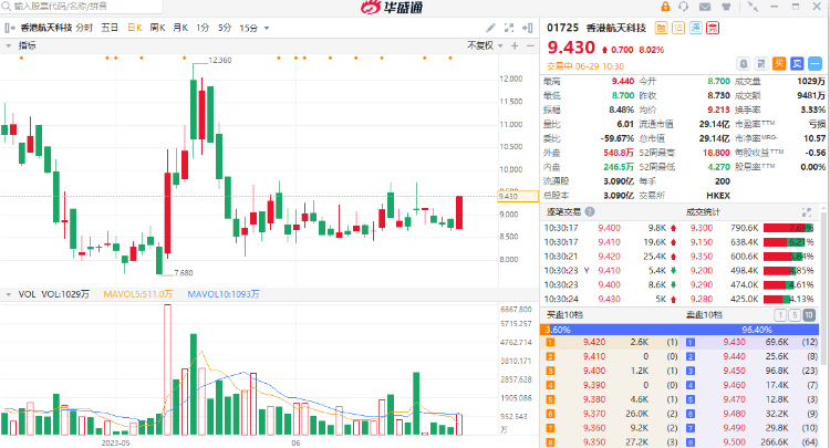 6月29日消息,香港航天科技港股早盘持续走高,截止发稿涨8.02%,报9.43港元,成交额9481万港元。