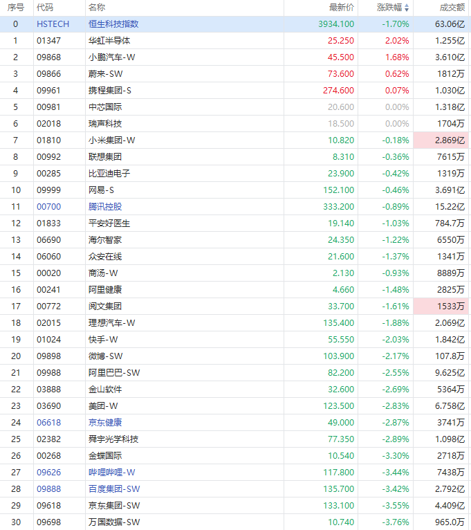 科网股多数走低,京东集团-SW、万国数据-SW、百度集团-SW、哔哩哔哩-SW跌逾3%,金山软件、阿里巴巴-SW、快手-W、美团-W跌超2%。