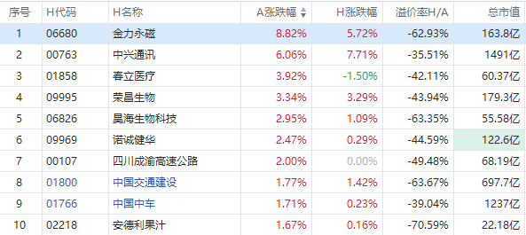 截至A股收盘,AH股涨幅前10如下:
