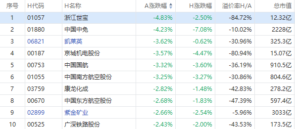 浙江世宝A股跌4.83%,H股现跌2.5%;中国中免A股跌4.23%,H股现跌7.08%,凯莱英A股跌3.62%,H股现跌0.62%。