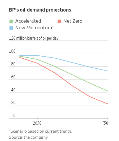 相比之下,欧洲石油生产商正在考虑能源转型进展更快的可能性。壳牌最新的能源安全报告指出了两种情景:一是即使没有新的气候政策,它也认为到本世纪中叶石油需求将下降10%左右。二是如果世界真正认真减少碳排放,那么石油需求就会暴跌。