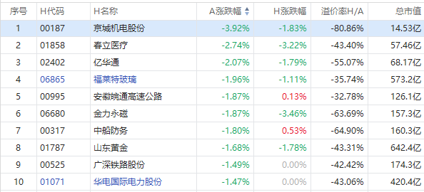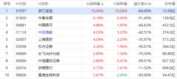 截至A股收盘,AH股涨幅前10如下:
