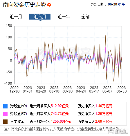 南下资金上,净买入的步伐放缓,近六个月净买入1255.66亿元,腾讯控股、中国移动、快手的净买入额居前,港交所、比亚迪股份、兖矿能源的净卖出额居前。