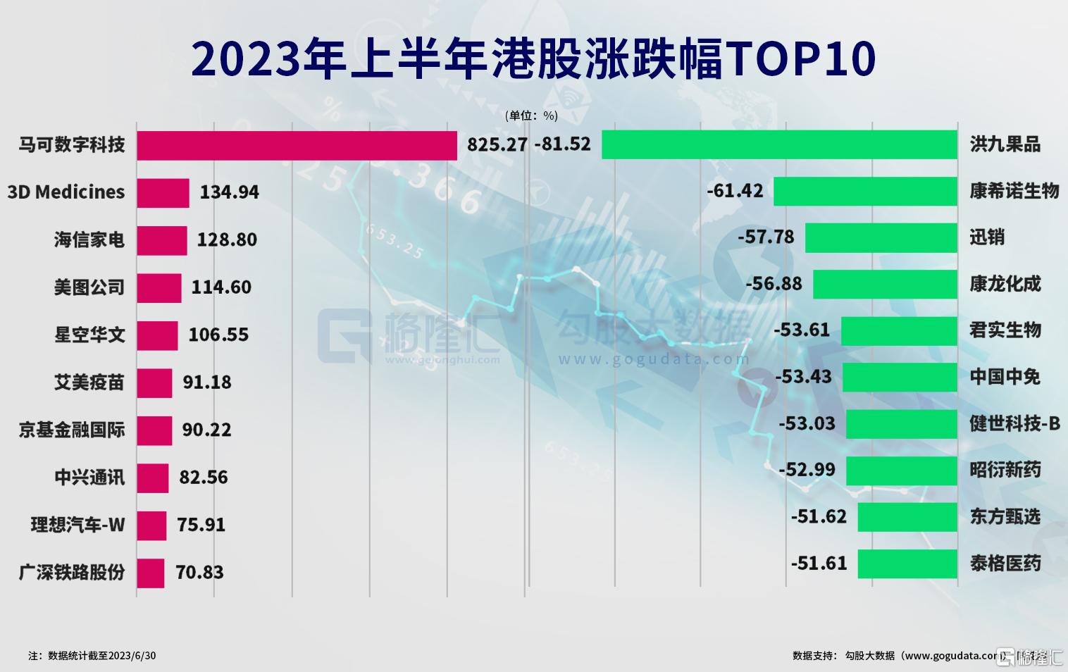 个股层面上,上半年,香港主板有41只个股股价涨幅超100%,131只个股股价腰斩(跌幅超50%)。