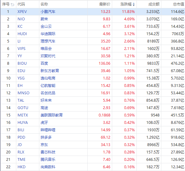 蔚来涨近5%,金山云涨超3%,理想汽车涨近3%,百度、新东方教育涨超1%,好未来、高途、虎牙、哔哩哔哩、拼多多、京东跟涨。