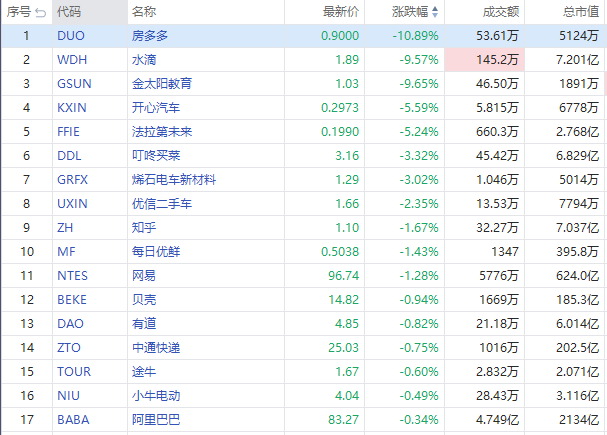 跌幅榜来看,金太阳教育跌超9%,法拉第未来跌超5%,叮咚买菜跌超3%,网易跌超1%,阿里巴巴跟跌。