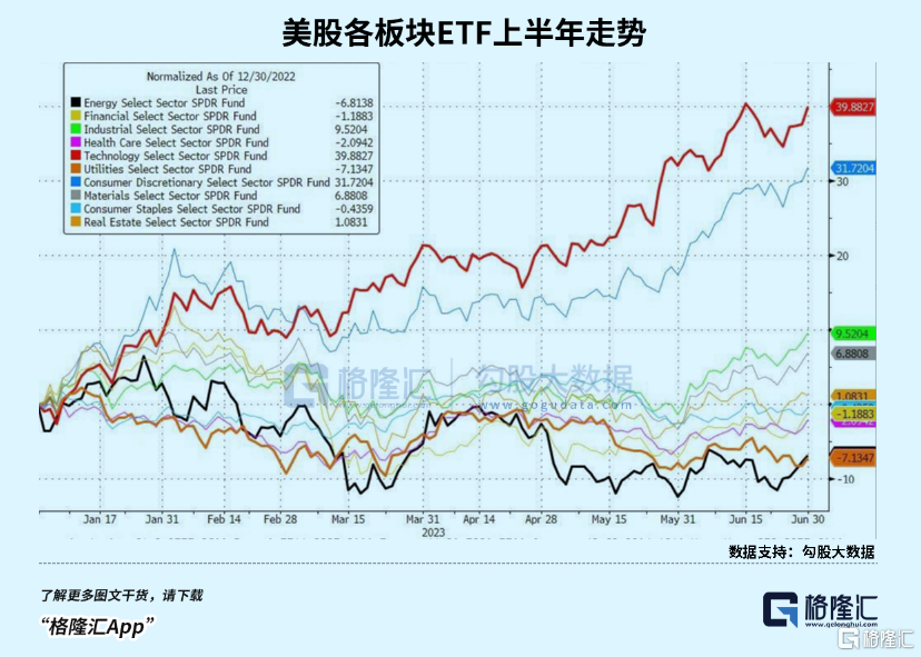 标普500指数的11个板块上半年多数收涨,费城半导体指数上半年均涨逾45%领涨,公用事业指数、能源指数均跌超5%,表现最差。