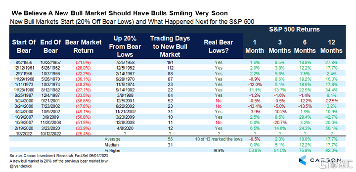 另一个角度,是从标普500重回牛市来看。机构Carson就总结了从50年代,每当标普500从低点涨回20%之后,指数在未来1个月到12个月的表现。