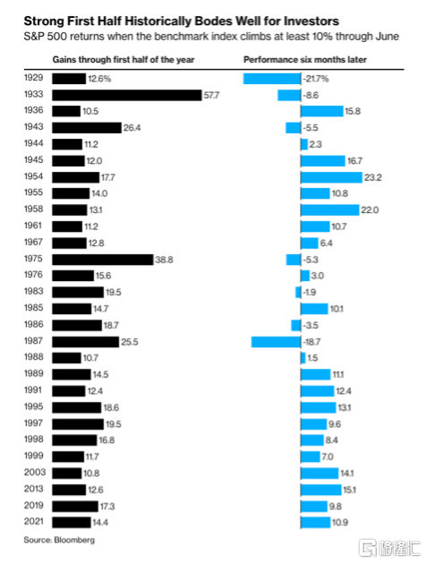 根据彭博社的数据,标准普尔500指数在上半年的强劲表现,通常会导致剩余六个月内再次出现强劲上涨。