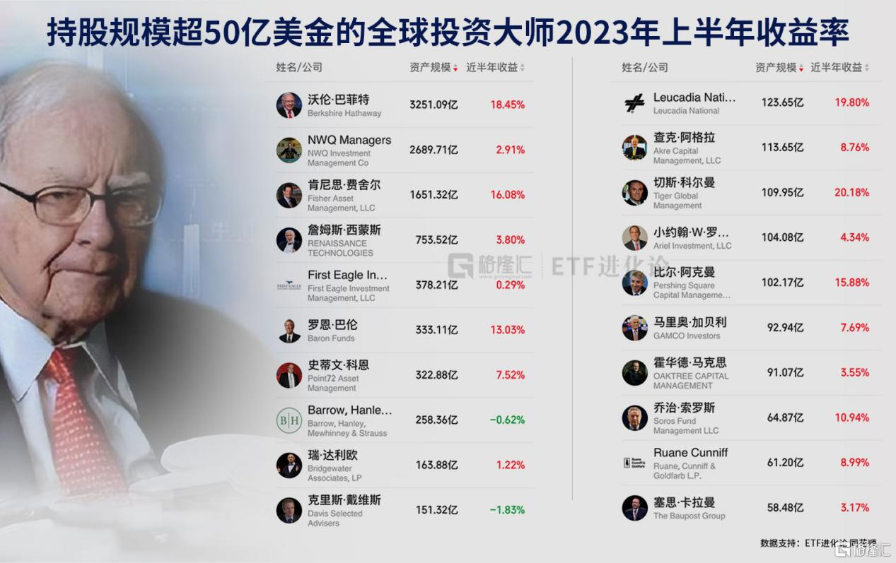 此外,随着美股今年疯狂上涨,全球投资大师上半年的收益率也是普遍收涨,具体来看,上半年里持股规模超50亿美金的全球投资大师中,巴菲特的资产规模为3251.09亿美元,收益率为18.45%;美国亿万富翁基金经理肯尼斯·费舍尔的资产规模为1651.32亿美元,收益率为16.08%。