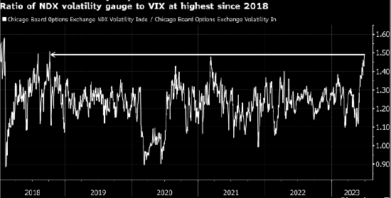 然而,有迹象表明投资者可能正在为未来的相对动荡做准备,VIX——基于期权定价衡量标普500指数预期波动性的指标——跌得更多,推动科技股与大盘的波动率指数之比升至2018年以来最高。