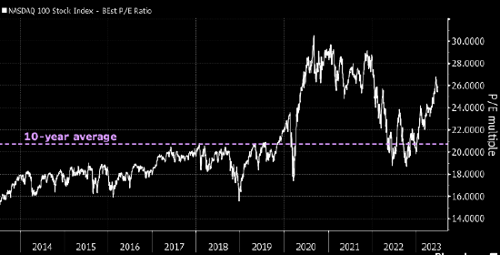 大涨引发了对估值的担忧。纳斯达克100指数的预期市盈率接近26倍,高于其10年均值21倍。苹果、微软和英伟达明显高于其平均水平,尽管仍低于疫情期峰值。