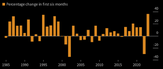 彭博对历史数据的分析显示,纳斯达克100指数今年以来的强势预示着2023年剩余时间可能也会表现不错。该指数上半年涨幅不低于10%的年份中,下半年平均涨幅约14%,不过,在上半年涨幅超过20%的年份中,下半年平均涨幅收窄至8.3%。