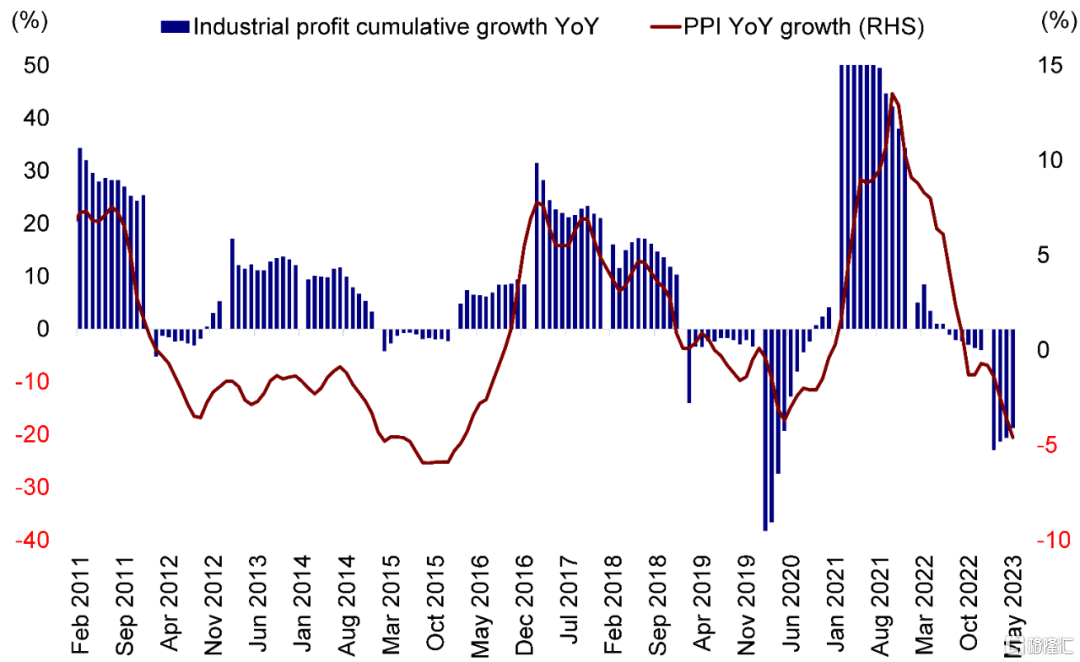2)1-5月全国规模以上工业企业利润同比下降18.8%,降幅较1-4月收窄1.8ppt。在41个工业大类行业中,14个行业利润总额同比增长。收入方面,1-5月规模以上工业企业营业收入同比增长0.1%,较1-4月增幅收窄0.4ppt。量上来看,5月工业增加值同比增长3.5%,增幅较4月下降2.1ppt;价上来看,5月PPI通胀同比下降4.6%,较4月继续下跌1.0ppt,受量价两方面因素共同影响下,工业企业的营业收入增速下滑。利润率方面,1-5月营业收入利润率为5.19%,同比下降1.21ppt,但好于1-4月的4.95%。整体上,经济保持复苏态势,工业企业利润增速降幅有望继续收窄[2]。