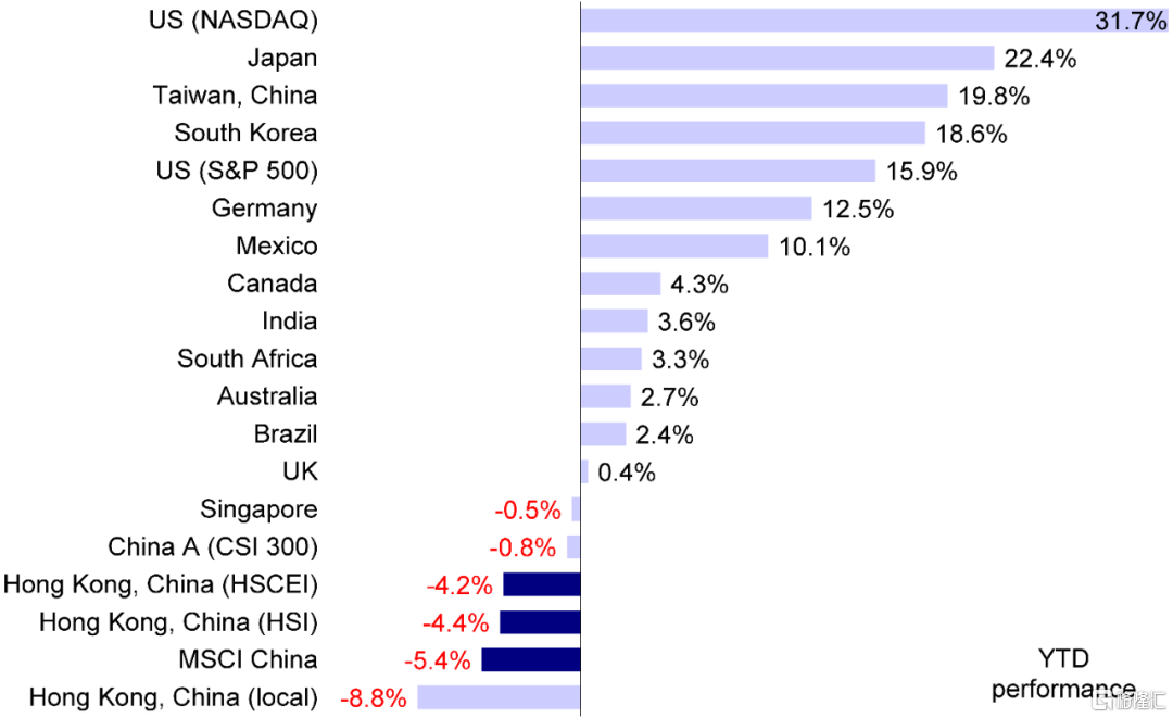 在此前市场因更多政策支持和中美关系改善两方面预期降温拖累而快速回撤后,海外中资股市场上周在相对低位逐步企稳。上周也是2023年上半年最后一周交易,回顾来看,港股市场整体明显跑输全球各主要市场,其中恒生指数下跌4.4%,恒生科技指数跌幅则为5.3%。