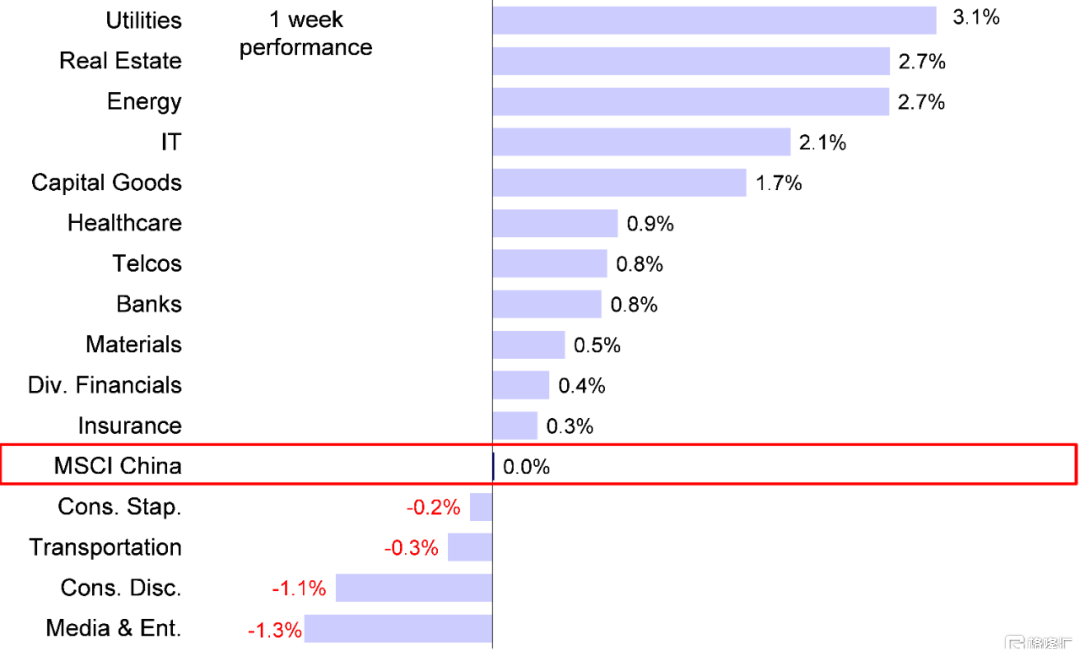 图表:MSCI中国指数上周走势基本持平,公用事业板块领涨