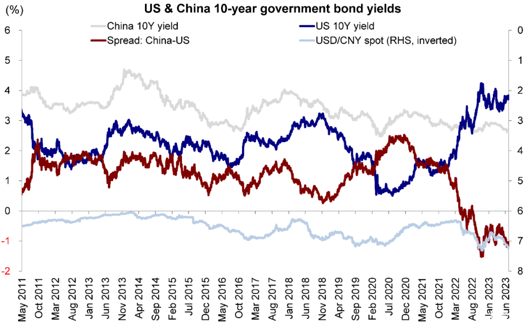 外部方面,美国经济表现好于预期推动7月美联储重启加息的预期升温,这增加了人民币汇率的压力。最新公布的1季度美国GDP数据表明,美国经济增长步伐仍然明显超出此前市场预期。具体来看,今年1季度美国GDP增长2%,显著高于1.4%的市场预期。虽然这一指标相对滞后,但是强劲的GDP增长仍然推动有关美联储可能在下次FOMC会议上恢复加息的预期升温。受此影响,10年期美债利率突破3.83%,离岸人民币也未能守住阵地,对美元汇率跌破7.27。但是,积极的一面是美国5月个人消费支出低于市场预期,表明通胀问题出现边际性改善。随着市场已经计入了7月美联储再度加息的预期,我们认为目前判断7月以后美国货币政策的走向可能仍然为时过早,依然需要等待更多信号到来。