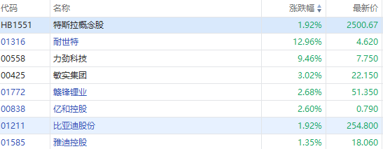 特斯拉第二季度交付量环比增长了10%,相关概念股应声上扬,耐世特(01316)涨12.96%,力劲科技(00558)涨9.46%,敏实集团(00425)涨3.02%,亿和控股(00838)涨2.6%,赣锋锂业(01772)涨2.68%。