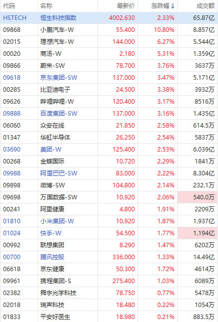 个股方面,小鹏汽车涨超10%,理想汽车涨超6%,商汤涨超5%,蔚来、京东、比亚迪电子、哔哩哔哩、百度涨超3%,众安在线、华虹半导体、美团、阿里巴巴、微博涨超2%,小米、快手、腾讯涨超1%。