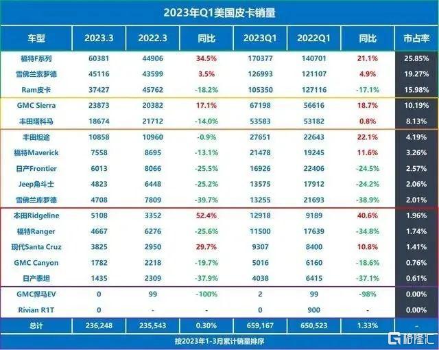 今年3月,美国市场销售皮卡新车236248辆,相比2022年3月235543辆的成绩,仅同比上涨0.3%;1-3月累计销售新车659167辆,较2022年同期上涨了1.33%。事实上,2020年以来,美国皮卡销量已经连续三年同比下降,销量较2019年跌去近10%。