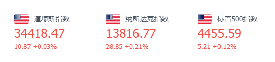 昨夜标普大盘和纳指齐创近15个月最高。道指涨10.87点,涨幅为0.03%,报34418.47点;纳指涨28.85点,涨幅为0.21%,报13816.77点;标普500指数涨5.21点,涨幅为0.12%,报4455.59点。法拉第未来涨超5%,百度、小鹏汽车、哔哩哔哩、蔚来、理想汽车、京东、网易、微博、腾讯音乐、唯品会、爱奇艺、阿里巴巴等热门中概股普涨。