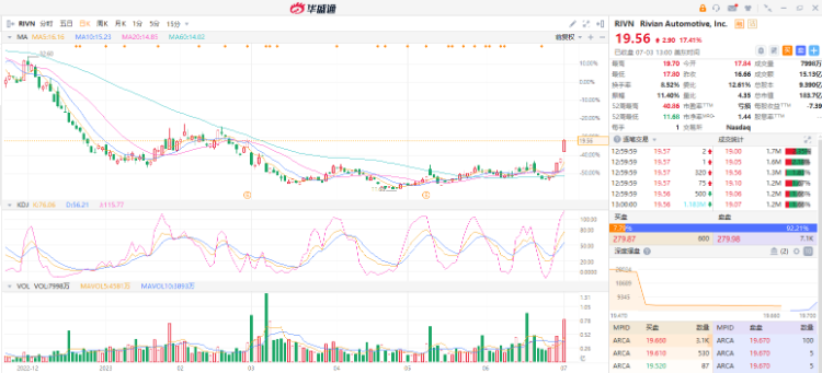 7月3日周一,亚马逊支持的美国电动汽车制造商Rivian公布的数据显示,该公司二季度汽车交付量为12640辆,较上一季度环比增长59%,超出市场预期的11000辆,该公司股价当天高开高走,收涨17.41%,报19.56美元,并在盘后延续涨势。