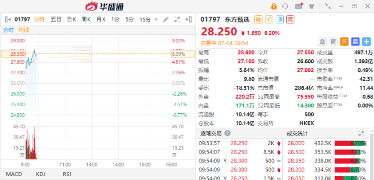 东方甄选高开逾3%,截至发稿,涨6.20%,报28.25港元,成交额1.392亿港元。