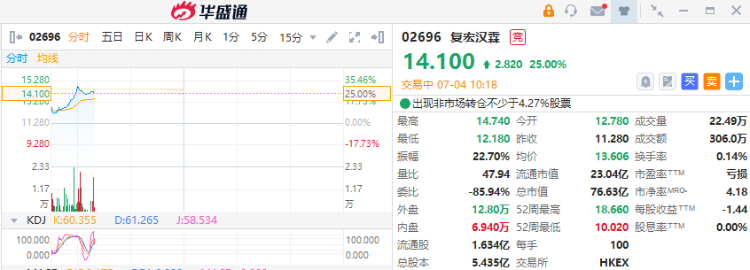 复宏汉霖(02696)盈喜后高开,一度大涨30%,截至发稿,涨25%,报14.1港元。