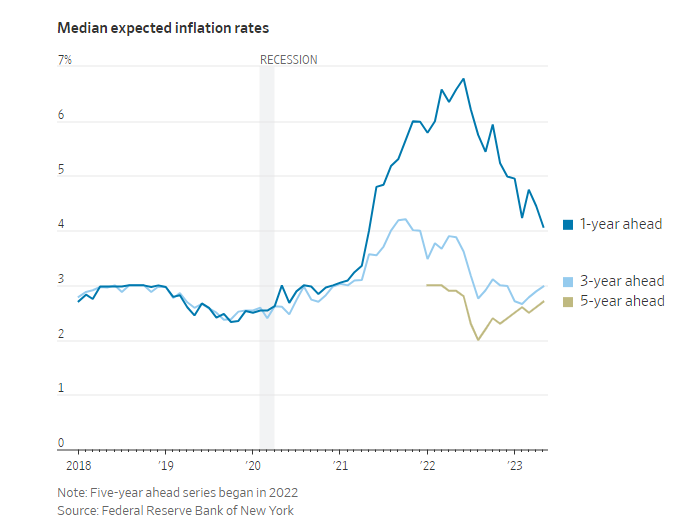 例如,根据对纽约联储5月份调查的中值,消费者预计一年后的通胀率为4.1%,为两年来的最低水平,远低于近期6.8%的峰值。