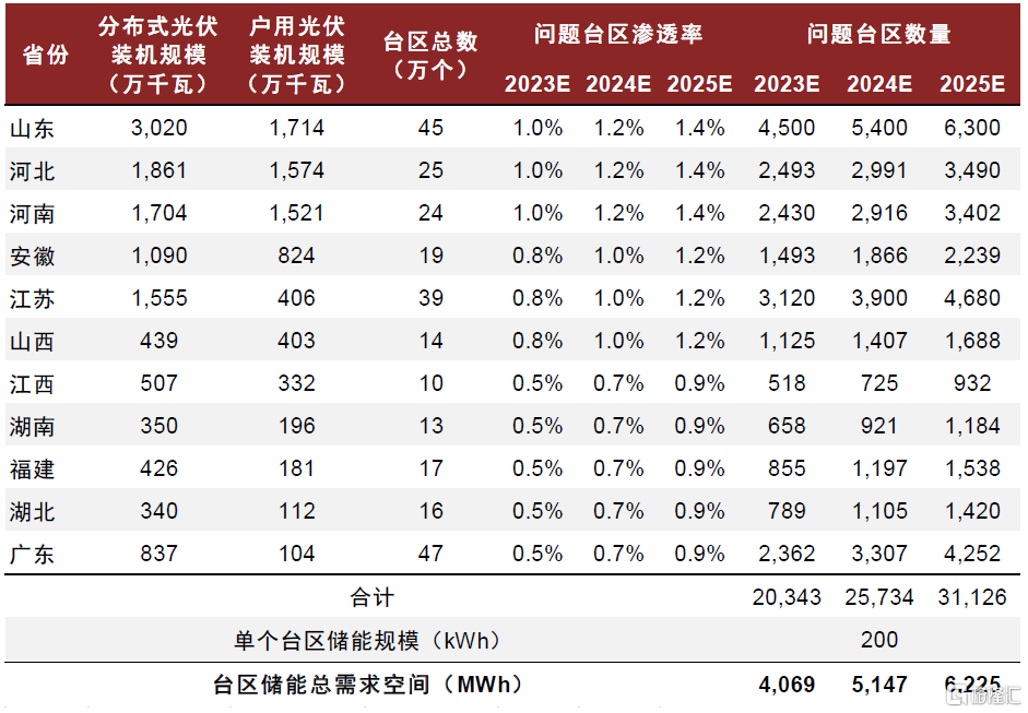 台区储能具备延缓变电扩容、解决电能质量问题等作用。建设台区储能可延缓台区变电扩容、促进电能质量改善、进行低电压治理、峰谷套利等,移动性还可以作为应急电源。我们选取山东、河北、河南等户用光伏装机规模大约在100万千瓦以上的省份,假设2023年存在重过载、三相不平衡、低电压等现象的问题台区渗透率大约在0.5%~1%,按照单个台区配储规模200kWh测算,2023/2024/2025年台区储能累计需求空间为4.1/5.1/6.2GWh。