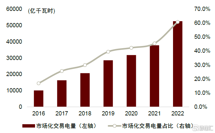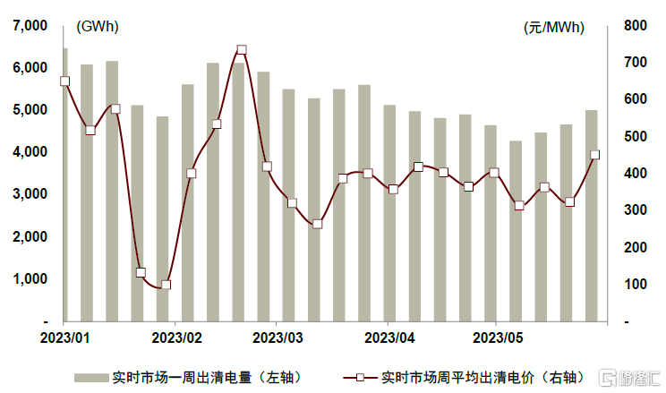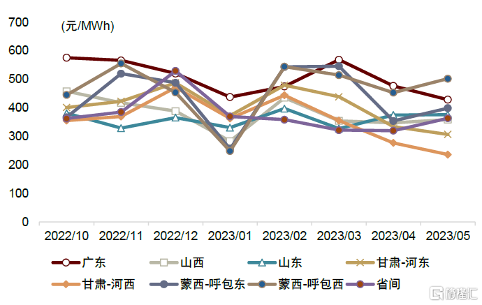 电力市场交易比例持续提升,五省电力现货试点常态化运行并向多省份推广。根据中电联统计[4],2022年全国电力市场化交易电量52543.4亿千瓦时,占全社会用电量60.8%,同比提高15.4个百分点。根据北京电力交易中心[5],2022年国网经营区域内新能源市场化交易电量占比达到34.8%。截至今年6月,广东、山西、山东、蒙西、甘肃电力现货市场已常态化运行,截至5月31日,山西省现货市场出清电量已达1134亿千瓦时;此外,辽宁、湖北、江苏、河南、安徽、江西等现货市场也已经开展多日连续结算试运行。