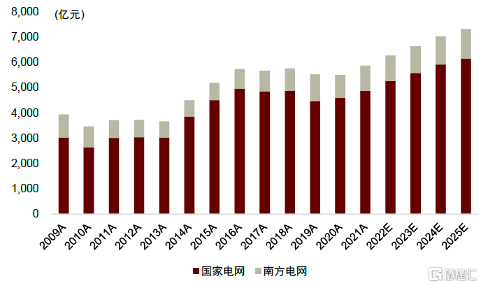注:南网投资口径为电网基建投资,不包括电源建设和技改投资;2022-2025年为中金公司预测资料来源:国网社会责任报告,南网社会责任报告,中金公司研究部