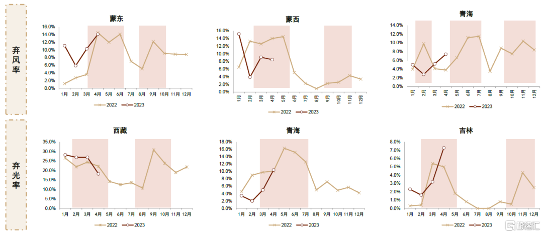 图表:消纳率较低省份的弃风弃光率高点出现在春秋两季