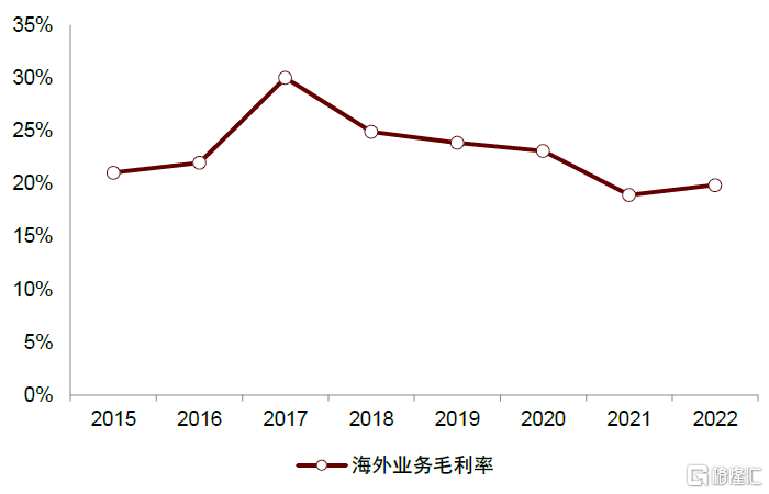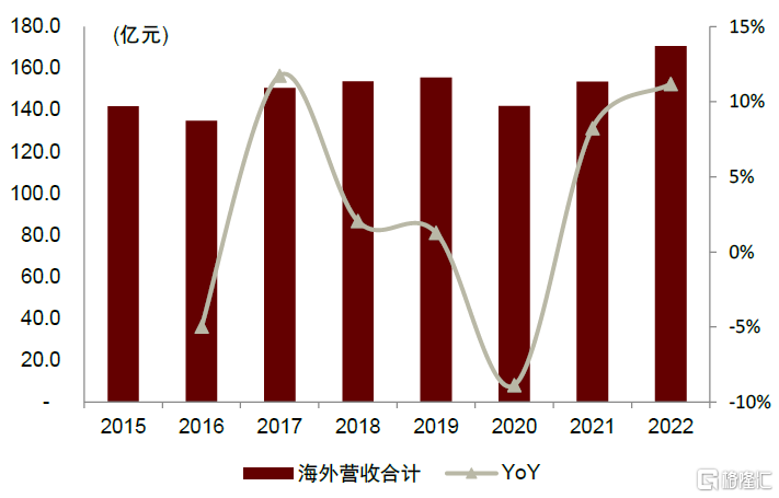 ► 整体海外业务规模保持稳健增长,盈利能力相对稳定。2022年样本企业海外营收合计达170.8亿元,同比+11.2%。除2020年受疫情影响海外营收同比-9%以外,近年来海外业务保持稳健增长。2021年受海运费上涨、EPC类收入占比提高等因素影响,海外业务整体毛利率有所下滑,2022年恢复到20%,整体来看海外盈利能力相对稳定。