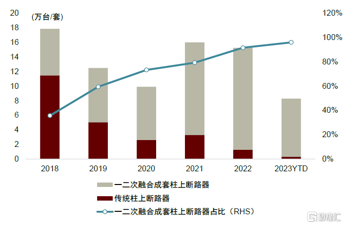 一二次融合成为主流技术趋势。传统配电网一次设备功能简单、智能化程度低,同时一次和二次设备间存在接口不匹配、兼容性差、维护困难等问题,为适应智能配电网的发展,一二次融合技术应运而生。一二次融合设备即对传统一次设备在物联感知、数据处理、智能、集成、通信等方面赋能,已成为配电网的重要发展方向。截至6月5日,2023年国网配网协议库存招标中一二次融合成套柱上断路器占断路器及负荷开关招标数量比重已达到96%。