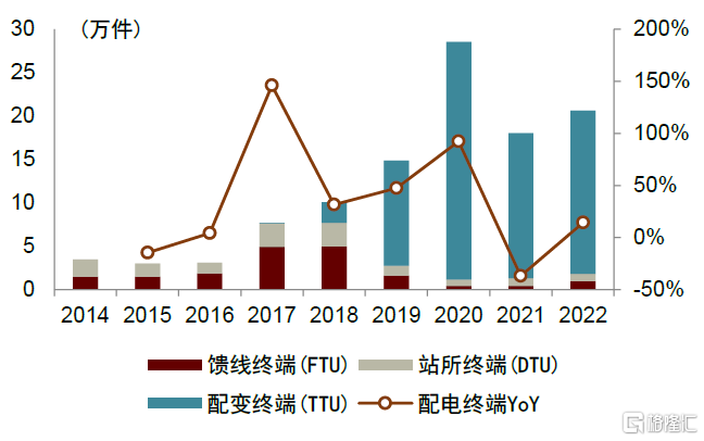 台区智能融合终端是对配电台区多种运行监测和计量设备进行的整合优化,其采用“云管边端”的智慧物联体系架构,接入了配电自动化系统、用电信息采集系统、物联管理平台,兼容低压智能开关、光伏逆变器、充电桩智能控制器、无功补偿装置等营配感知设备,并具备光伏电站实时监测控制、可开放容量分析等功能。台区智能融合终端自2019年开始招标,近年来国网设备部、数字化部正在积极推动“一台区一终端”,我们估计当前台区渗透率尚不足20%,仍处在快速推广阶段。从中标情况来看,相较于传统终端设备,台区智能融合终端格局更为集中。