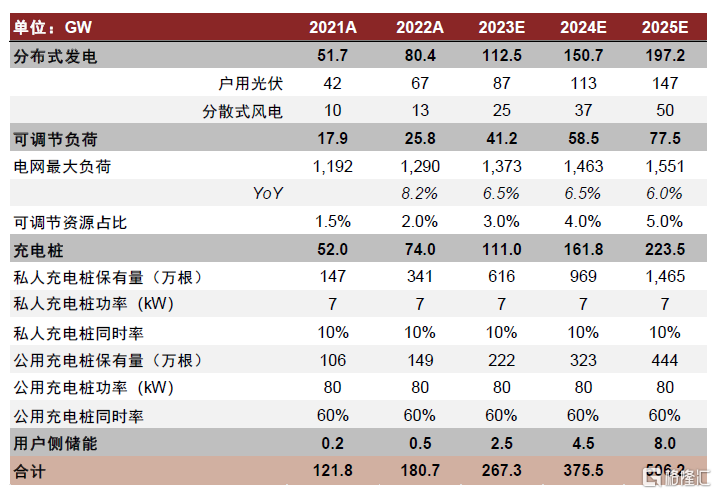 我们预测到2025年国内虚拟电厂理论可聚合资源空间达到500GW。目前,国内虚拟电厂可聚合资源主要包括分布式发电、可调节负荷、充电桩、用户侧储能等,其中分布式发电主要考虑户用光伏和分散式风电。我们按照各类资源的装机量测算2023/2024/2025年我国虚拟电厂理论可聚合资源规模分别为267/376/506GW,CAGR为37.6%。