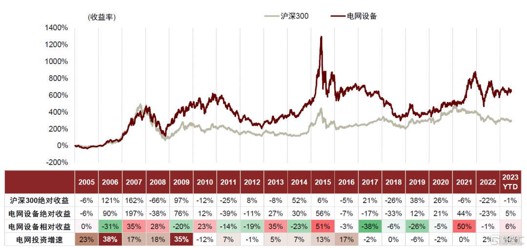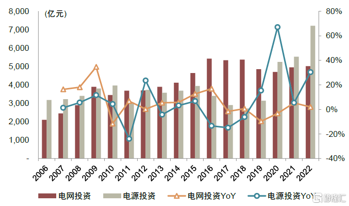 电力投资具备一定逆周期特性,电网投资滞后于电源投资,建设发展需求旺盛。由于电力投资体量大、产业链带动效果显著的特点,具有一定的逆周期属性,我们预计电力投资将作为经济提振的助推剂,投资金额实现加速提升。此外,2020-2022年电网工程投资额分别为4896/4916/5012亿元,同比增速仅为-2.3%/0.4%/2.0%,尚未呈现明显提速态势,而相对应的电源年投资额YoY则为67.1%/5.5%/30.3%。我们认为我国电力投资目前已呈现出显著的电网滞后电源趋势,未来电网投资建设有望持续加速以满足终端的用电需求。