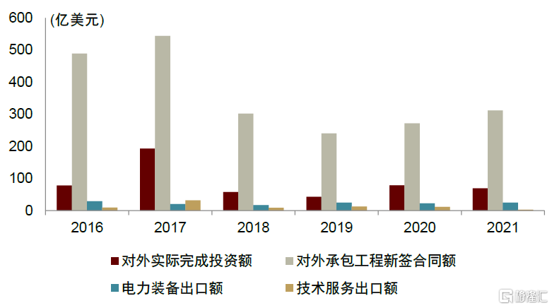 中国电力设备出口势头较好。根据中电联统计,2021年中国主要电力企业对外承包工程新签合同额311.9亿美元,同比+14.8%;出口电力装备总额25.0亿美元(其中,直接出口4.1亿美元,境外工程带动装备出口20.9亿美元),同比+12.1%。
